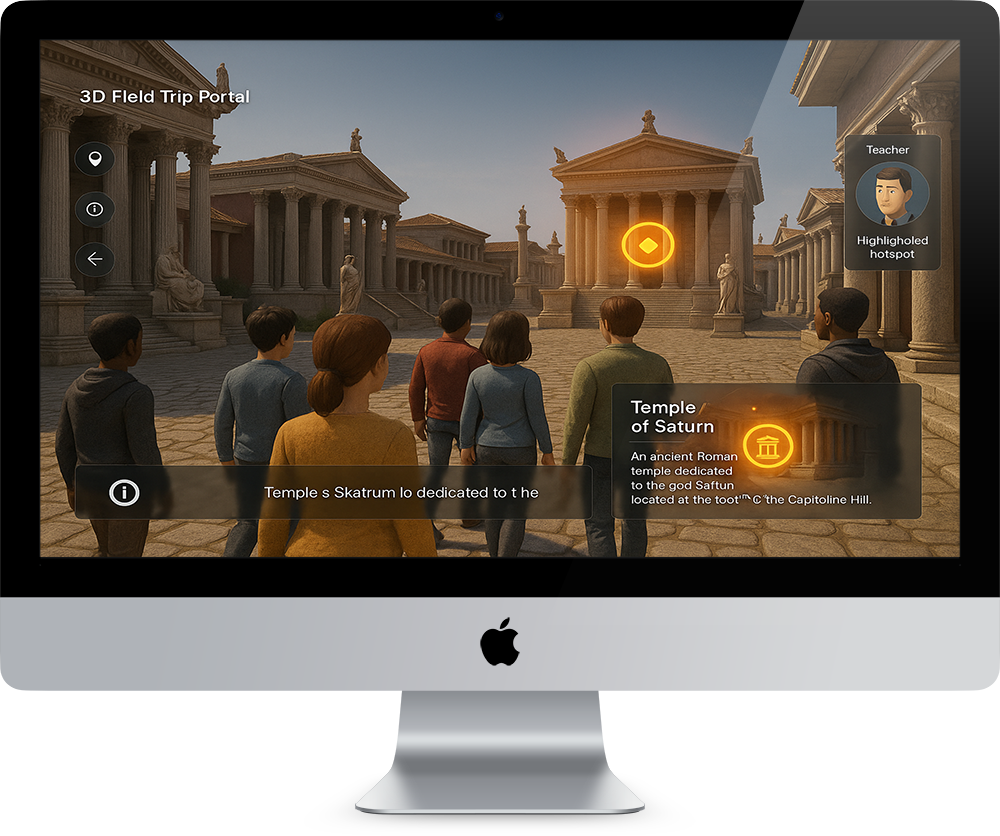 An on-demand 3D exploration platform that lets students take virtual field trips across time and space—from Ancient Rome to the Amazon rainforest or even Mars—without leaving their browser.