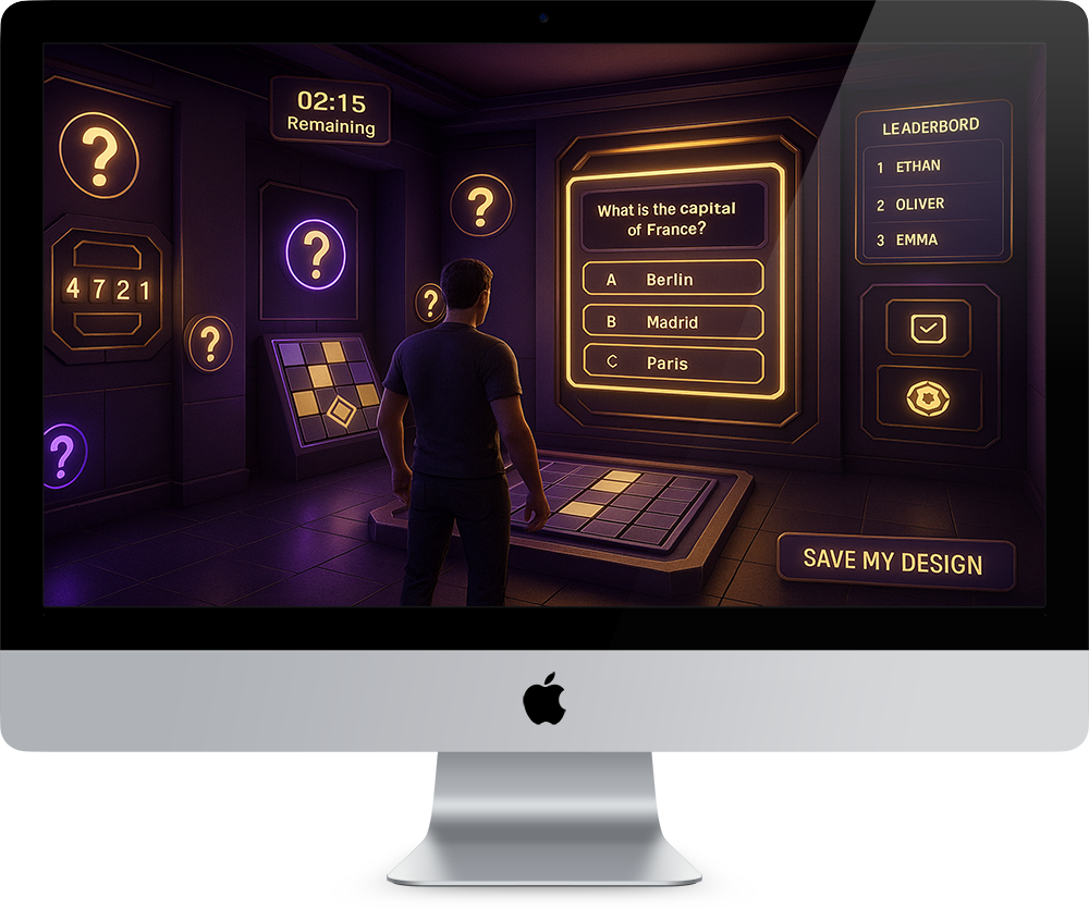 A 3D escape room and puzzle builder SaaS, designed for training, learning, and lead generation. Businesses can create branded escape rooms, trivia challenges, or puzzle journeys that entertain while educating or capturing leads.